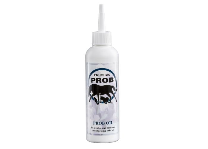 PROB Olja är en alkohol- och tjärbaserad olja för torr, känslig och irriterad hud hos både hästar och hundar. Den är särskilt effektiv på hudområden som utsatts för insektsbett eller sol, till exempel mankam, svansrot och tassar.